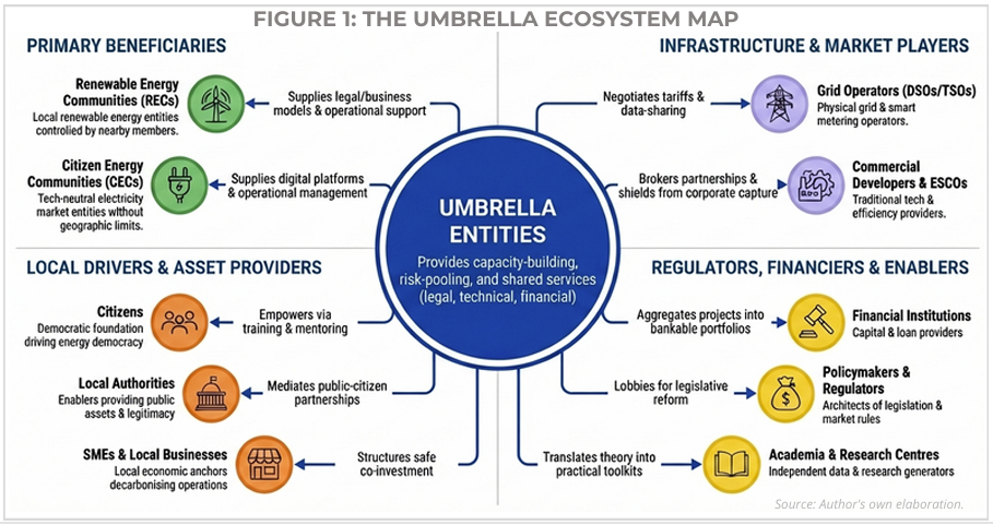 In many cases, umbrella entities also serve as a bridge between local initiatives and higher levels of governance, connecting energy communities with funding programmes, policymakers and national energy strategies. By strengthening coordination and professional support, these organisations can significantly accelerate the growth and sustainability of local energy initiatives.