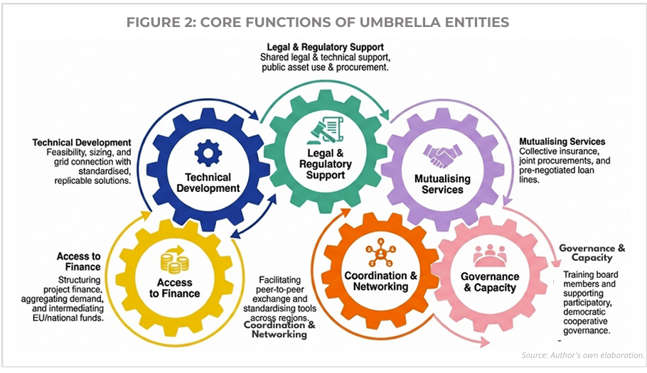 Umbrella entities act as intermediary organisations that support multiple local energy communities by pooling resources, expertise and organisational capacity. They can take various forms, including federations of energy cooperatives, second-level cooperatives, or specialised support platforms. By operating at a broader territorial or national level, umbrella entities can provide services that individual communities may struggle to deliver on their own. These organisations typically support energy communities through: